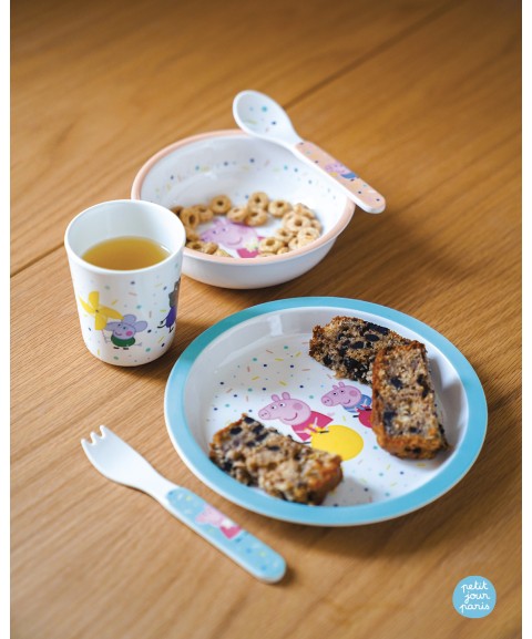 This 5 piece tableware gift set includes everything a child needs to have a fun and safe meal: a plate, a bowl, a 2 piece cutlery set and a drinking cup.