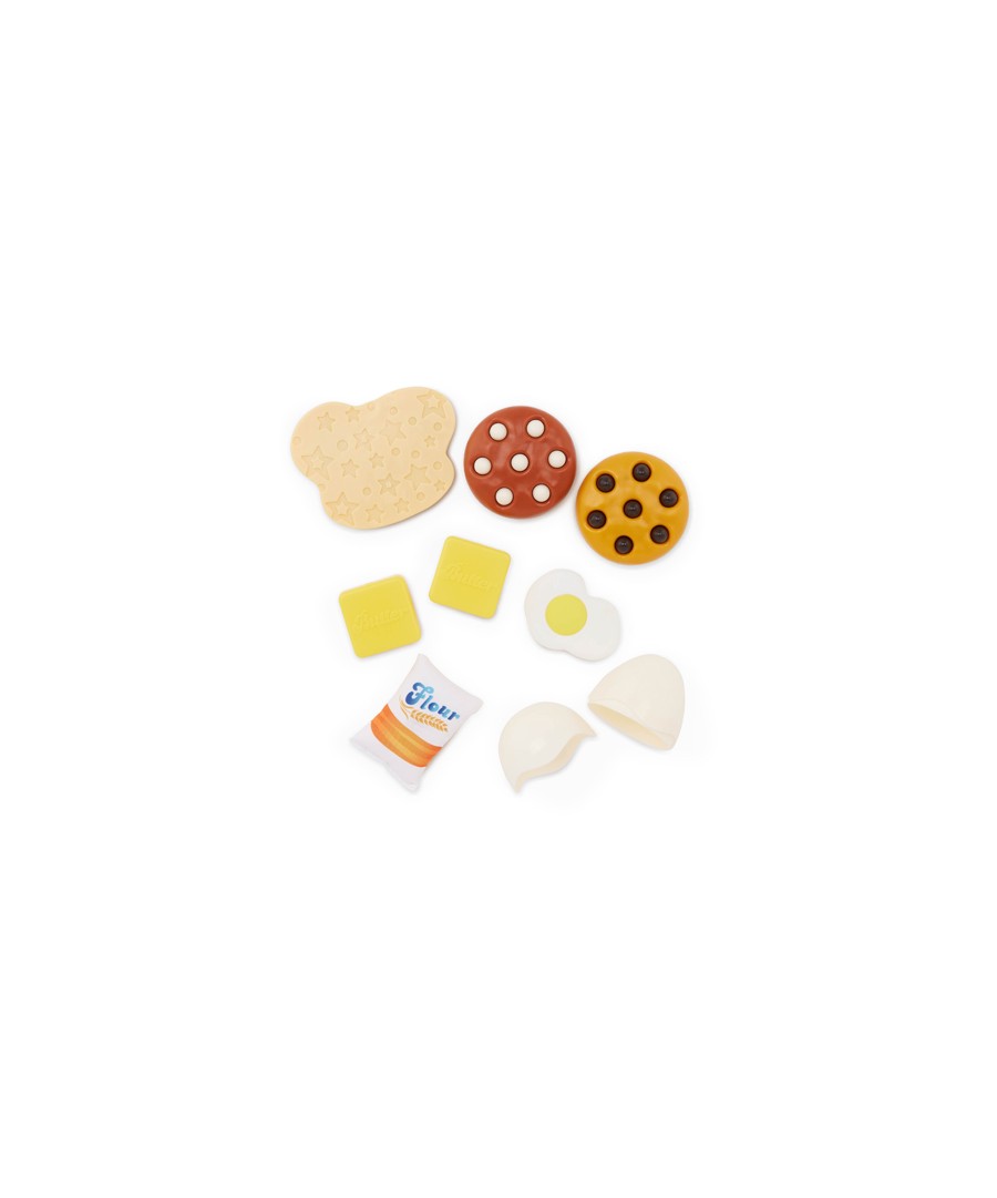 This play food set comes with a mixer, bowl, spatula, rolling pin, piece of dough, flour bag, egg with egg shells, butter, and chocolate chip cookies.