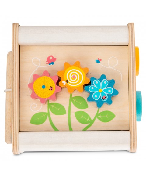 Un cube d'activités multifonctionnel pour les tout-petits, avec une belle structure en bois et un design compact.