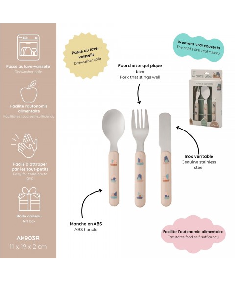 Set de 3 couverts pour apprendre à manger tout seul. Il est composé d'une fourchette, d'un couteau et d'une cuillère en inox.