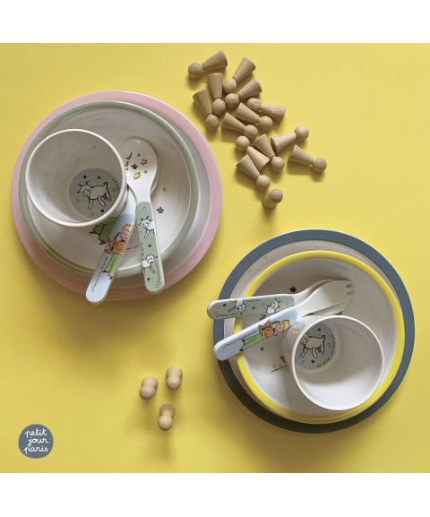 Un joli set de 5 pièces, avec rebords ergonomiques pour aider l'enfant à prendre les aliments et manger presque tout seul.