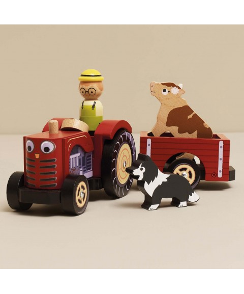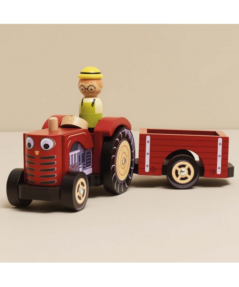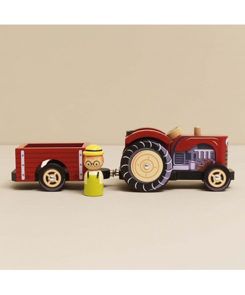 En route pour la ferme avec ce superbe tracteur en bois rouge et sa remorque magnétique !